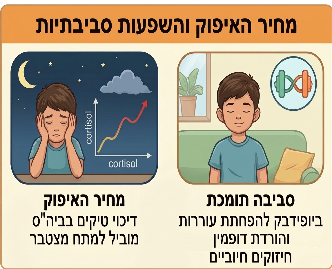 כהורים, חשוב שנבין את המאמץ האדיר שמשקיעים הילדים באיפוק. מחקרים מראים כי ילדים עם תסמונת טורט סובלים לעיתים מלחץ כרוני כל כך גבוה, עד שרמות הקורטיזול שלהם בלילה אינן יורדות כצפוי. המאמץ לדכא את הטיקים לאורך היום בבית הספר גובה מחיר יקר של עייפות ומתח מצטבר.