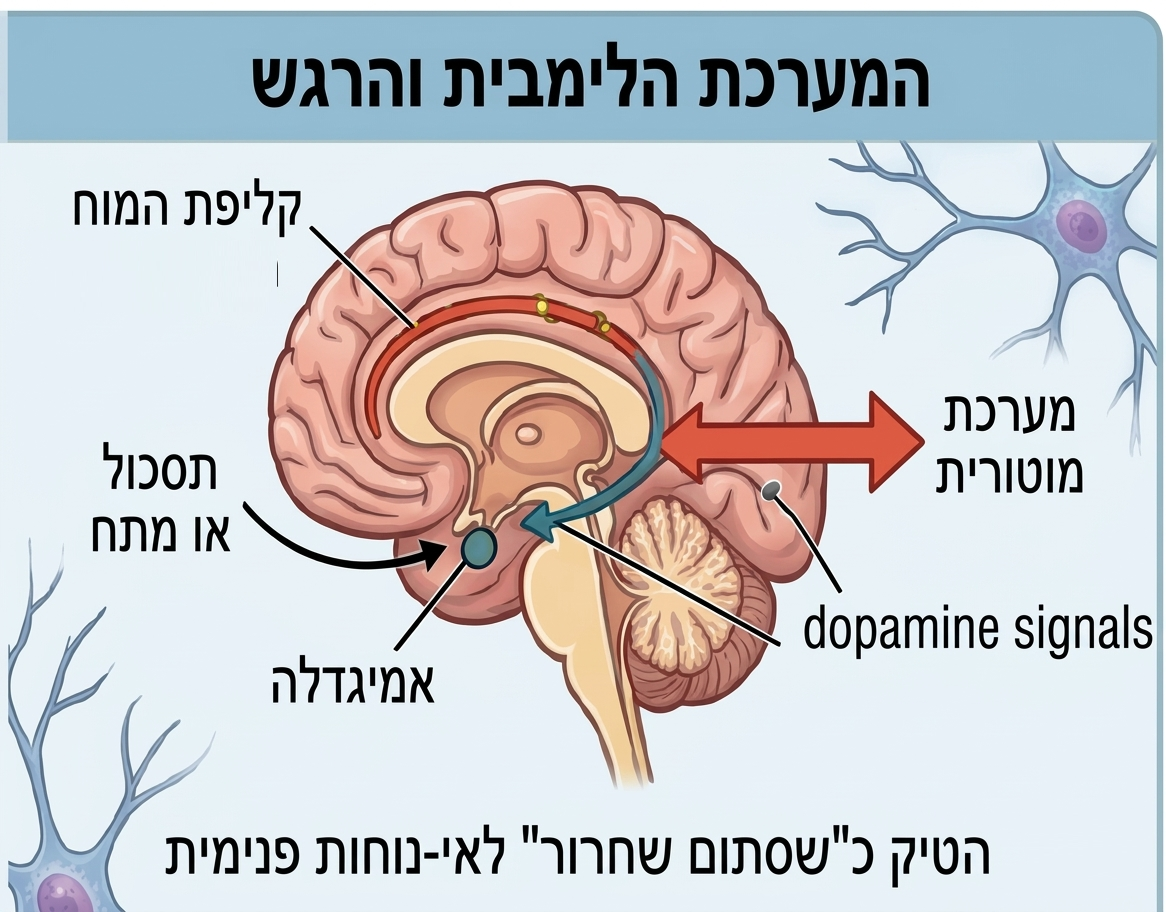 המוח שלנו אינו פועל במדורים מבודדים. המערכת הלימבית, שאחראית על עיבוד רגשות (הכוללת את האמיגדלה וקליפת המוח החגורתית), מקיימת קשר הדוק עם המערכת המוטורית.