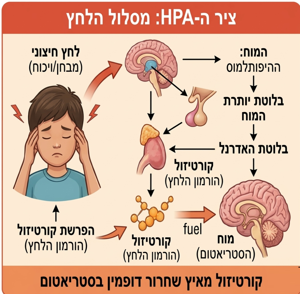 לדוגמה, כאשר ילד חווה לחץ חיצוני (כמו מבחן או ויכוח), המוח מפעיל שרשרת תגובות כימית: ההיפותלמוס משחרר הורמון שמעורר את בלוטת יותרת המוח, וזו גורמת להפרשת קורטיזול (הורמון הלחץ) מהאדרנל. הקורטיזול אינו מסתפק רק בהכנת הגוף ל”לחימה או בריחה”; הוא פועל כדלק שמאיץ את שחרור הדופמין בסטריאטום. במילים פשוטות: המתח הרגשי “מתדלק” ישירות את עודף הדופמין שבבסיס הטיקים.